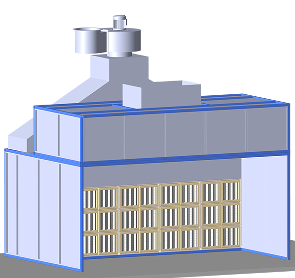 漆霧分離室位于噴涂作業(yè)室的一側(cè),內(nèi)部設(shè)置一排折流式漆霧分離箱。空氣攜帶過(guò)噴的漆霧由噴涂作業(yè)室的一側(cè)進(jìn)入折流式漆霧分離箱,在空氣折流式漆霧分離箱過(guò)程中,空氣中的漆霧被分離。潔凈的空氣由漆霧分離箱排出,進(jìn)入分風(fēng)管,而后進(jìn)入主風(fēng)管。