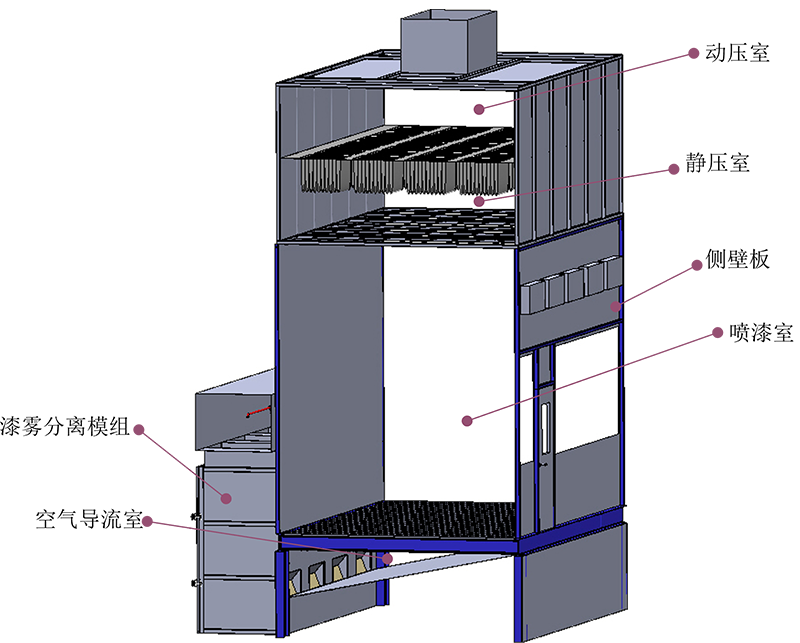 抽屜式漆霧分離模組干式噴漆室依次包括進(jìn)風(fēng)管、動(dòng)壓室和靜壓式、噴漆作業(yè)室、漆霧捕集分離室、排風(fēng)管、排風(fēng)機(jī)等。